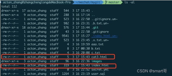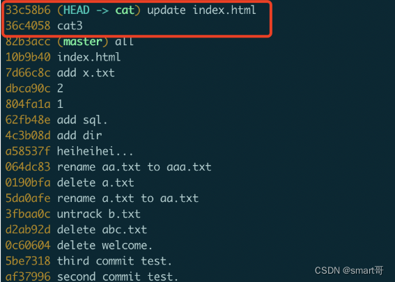 因为master现在已经合并了cat分支,所以在cat分支新增的cat3.html文件在master分支也出现了。