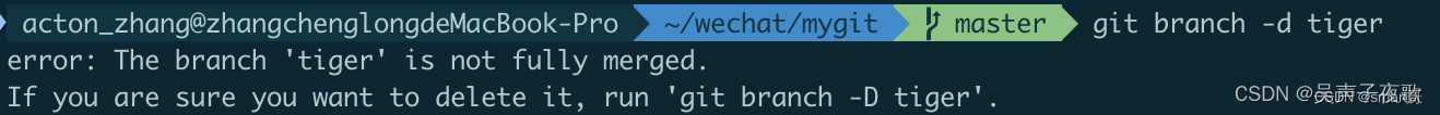 因为tiger的内容还没有被合并,所以使用-d参数无法将其删除。这时只需改用-D参数即可将其强制删除: