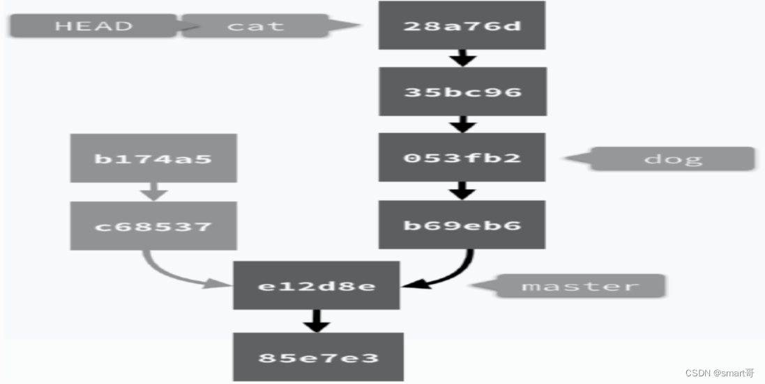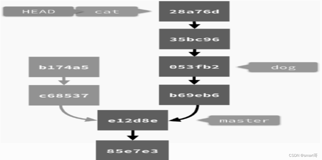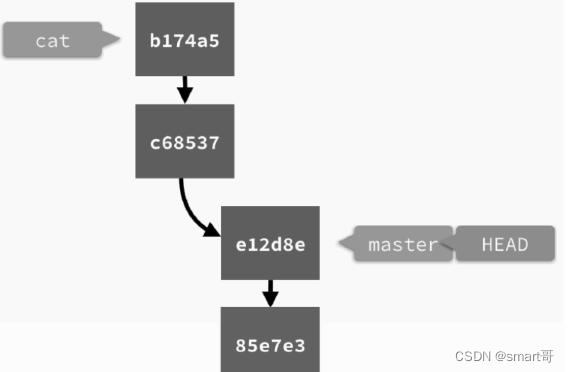 - 最后,原本的cat是指向b174a5这个Commit的,现在转而指向最后做出来的那个新的Commit对象28a76d。