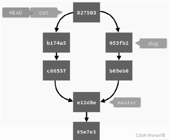 在此假设从master分支创建了cat和dog两个分支,并且当前正在cat分支: