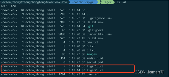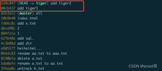可以看到,前面的那个星号已经移到tiger分支上了。