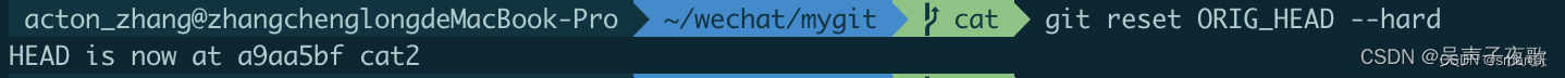 这个a9aa5bf (cat) HEAD@{5}: commit: cat2就是开始做Rebase前的最后动作,所以就是这个Commit了!下面使用Reset命令硬切回去: