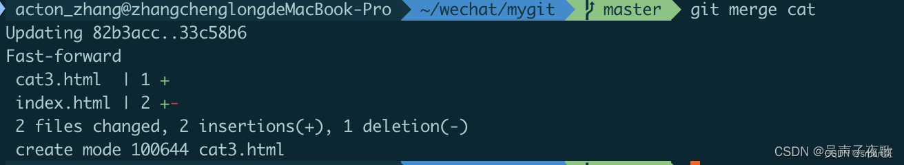 任务执行得差不多了,就要准备合并回来了。如果想要用master分支来合并cat分支,就要先切换回master分支: