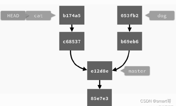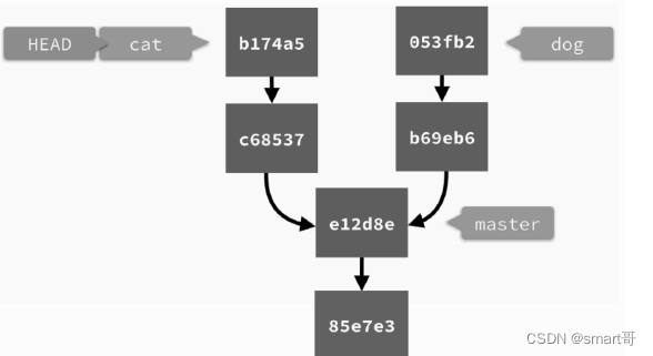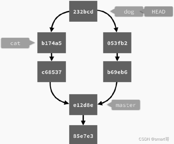 用通俗的话来说,上述命令的含义大致就是“我(即cat分支)现在要重新定义我的参考基准,并且将使用dog分支作为我新的参考基准”。