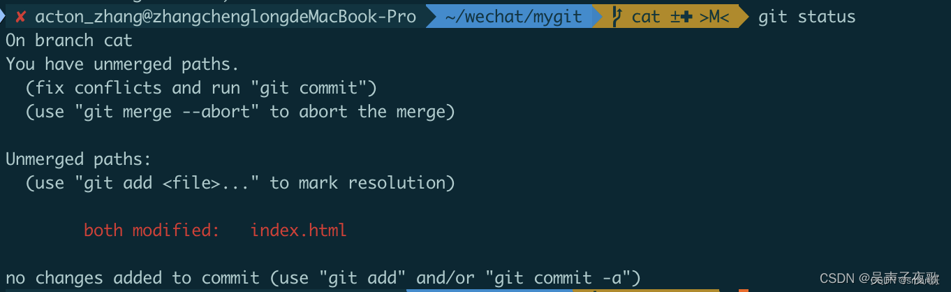 因为index.html文件的两边都被改动了,所以Git把它标记成both modified状态。