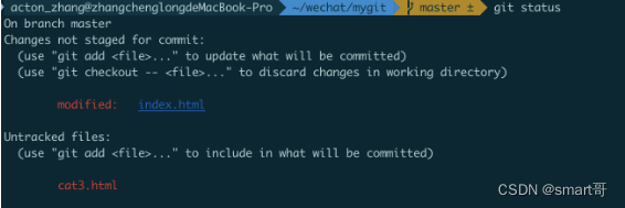 这时Git发现那个index.html文件出现问题了。我们先看一下当前的状态: