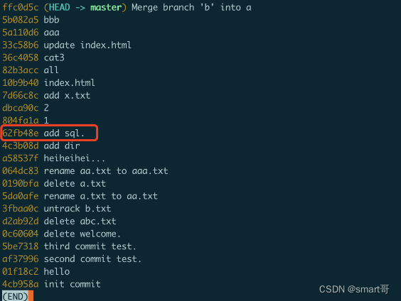 要从add sql.的Commit(62fb48e)中再做出新的分支,首先要回到那个Commit的状态,这时使用的是git checkout命令:
