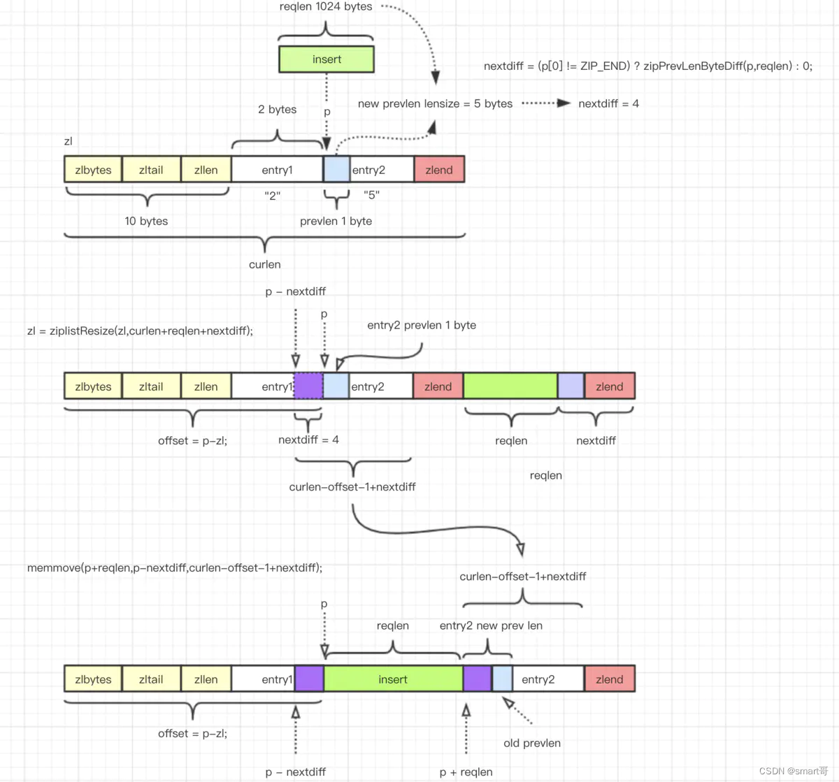 // 插入位置的后一个结点的<prevlen>发生改变, nextdiff 计算 <prevlen> 的 lensize 相差多少。