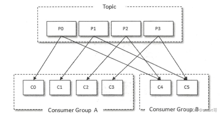 每个Consumer都要属于一个consumer.group消费者组,Topic的一个分区只会分配给一个消费组下的一个Consumer来处理,每个Consumer可能会分配多个分区,也有可能某个Consumer没有分配到任何分区: