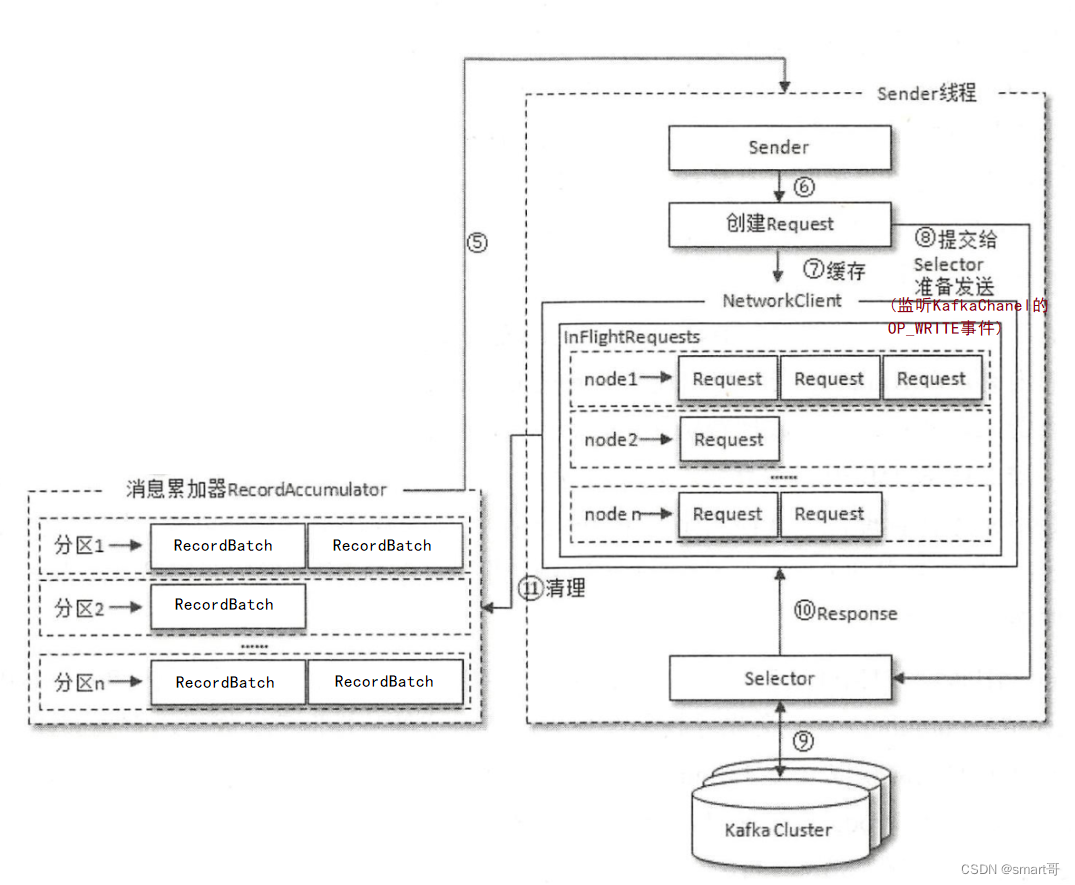 Selector会监听各个Channel的OP_WRITE事件,那么当后续Sender线程执行Selector.poll()方法时,Selector如果轮询到了OP_WRITE事件的发生,就会将Channel中的请求发送给Broker。