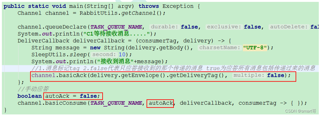 默认消息采用的是自动应答,所以我们要想实现消息消费过程中不丢失,需要把自动应答改为手动应答,消费者在上面代码的基础上增加下面画红色部分代码。
