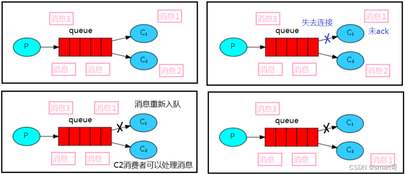 如果消费者由于某些原因失去连接(其通道已关闭,连接已关闭或 TCP 连接丢失), 导致消息未发送 ACK 确认, RabbitMQ 将了解到消息未完全处理,并将对其重新排队。如果此时其他消费者可以处理,它将很快将其重新分发给另一个消费者。这样,即使某个消费者偶尔死亡,也可以确保不会丢失任何消息。