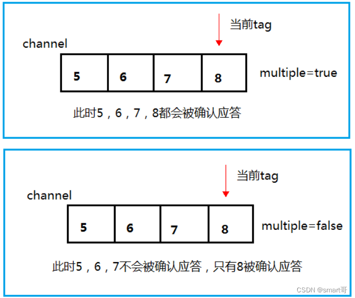 比如说 channel 上有传送 tag 的消息 5,6,7,8 当前 tag 是 8 那么此时 5-8 的这些还未应答的消息都会被确认收到消息应答