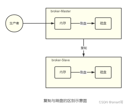- 异步刷盘:当消息写入到broker的内存后即表示消息写入成功,无需等待消息持久化到磁盘。
