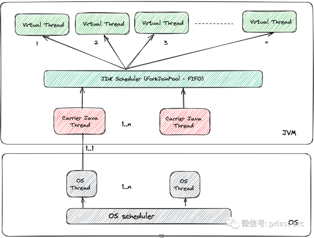 - 改善阻塞操作的处理:在传统线程模型中,阻塞操作(如 I/O)会导致整个线程被阻塞,浪费宝贵的系统资源。然而当一个虚拟线程阻塞时,它可以被挂起,底层的操作系统线程则可以用来运行其他虚拟线程。