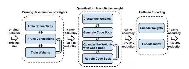 Han S 提出一套完整的深度网络的压缩流程:首先修剪不重要的连接,重新训练稀疏连接的网络。然后使用权重共享量化连接的权重,再对量化后的权重和码本进行霍夫曼编码,以进一步降低压缩率。如图 2 所示,包含了三阶段的压缩方法:修剪、量化(quantization)和霍夫曼编码。