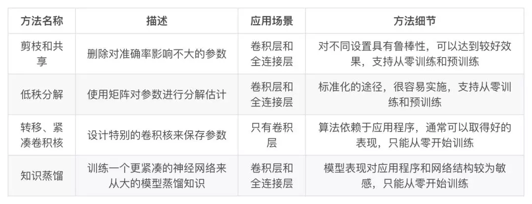 当然,网络模型的压缩和加速的最终实现需要多学科的联合解决方案,除了压缩算法,数据结构、计算机体系结构和硬件设计等也起到了很大作用。本文将着重介绍不同的深度模型压缩方法,并进行对比。