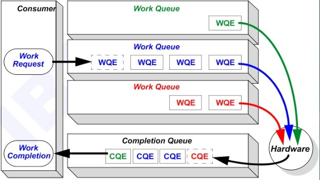 如图4所示,图中Work queue即是QP中的send Queue或者receive Queue,WQ中的请求被处理完成之后,就被放到Work Completion中。