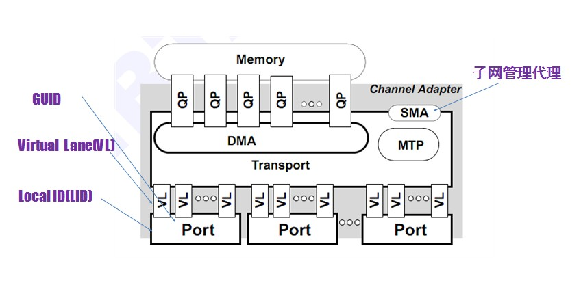 如图3所示,每个端口具有一个GUID(Globally Unique Identifier),GUID是全局唯一的,类似于以太网MAC地址。运行过程中,子网管理代理(SMA)会给端口分配一个本地标识(LID),LID仅在子网内部有用。QP是infiniband的一个重要概念,它是指发送队列和接收队列的组合,用户调用API发送接收数据的时候,实际上是将数据放入QP当中,然后以轮询的方式将QP中的请求一条条的处理,其模式类似于生产者-消费者模式。
