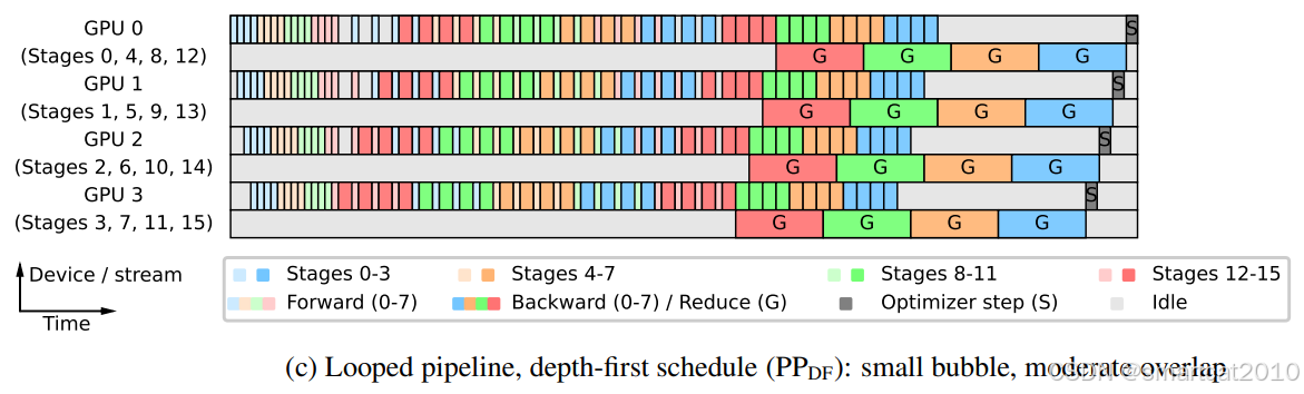 在Interleaved-1F1B的基础上,优先把所有micro-batches的forward都计算完毕,再计算backward;每次计算完1个stage的layers的backward,就立马reduce(应该是reduce-scatter) gradients,通过最大程度的重叠通信和backward计算,实现了耗时缩短;