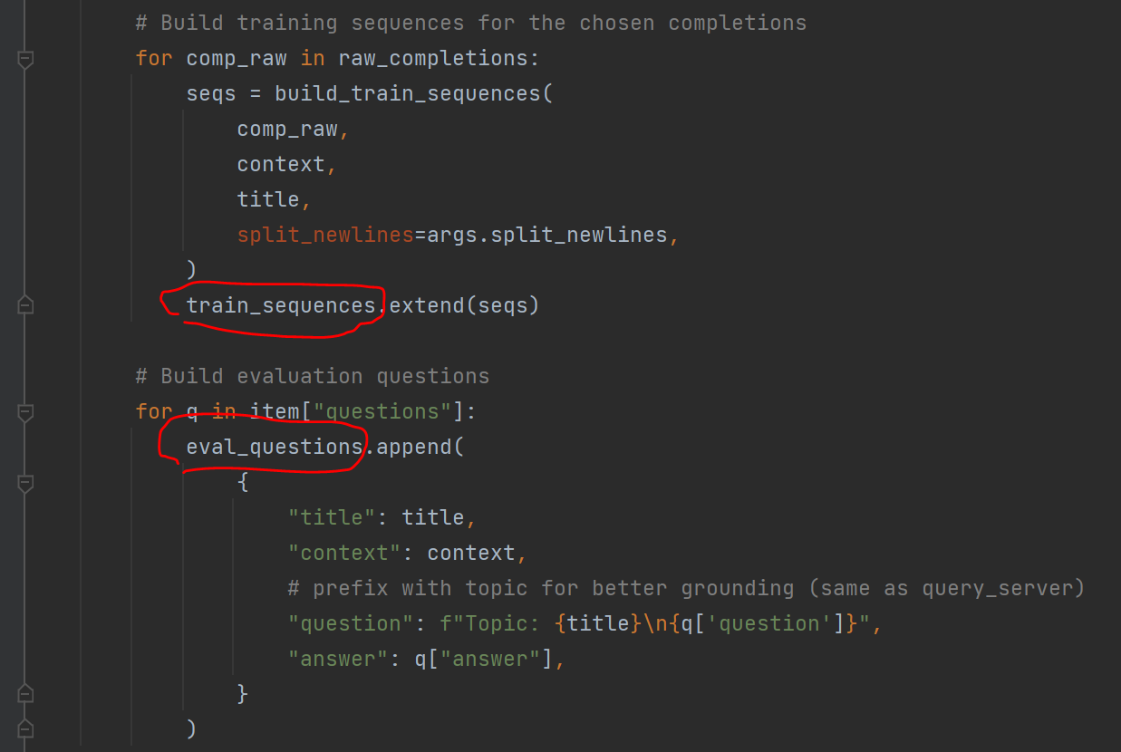 读取base_val.json,把所有self-edits制作成训练数据train_sequences,把所有question制作成评测数据eval_questions: