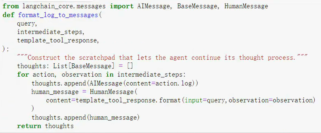 根据agent提供的tool调用中间步骤(intermediate_steps),构造Messages(action是调用tool的名称和参数,observation是调用tool得到的tool输出结果):