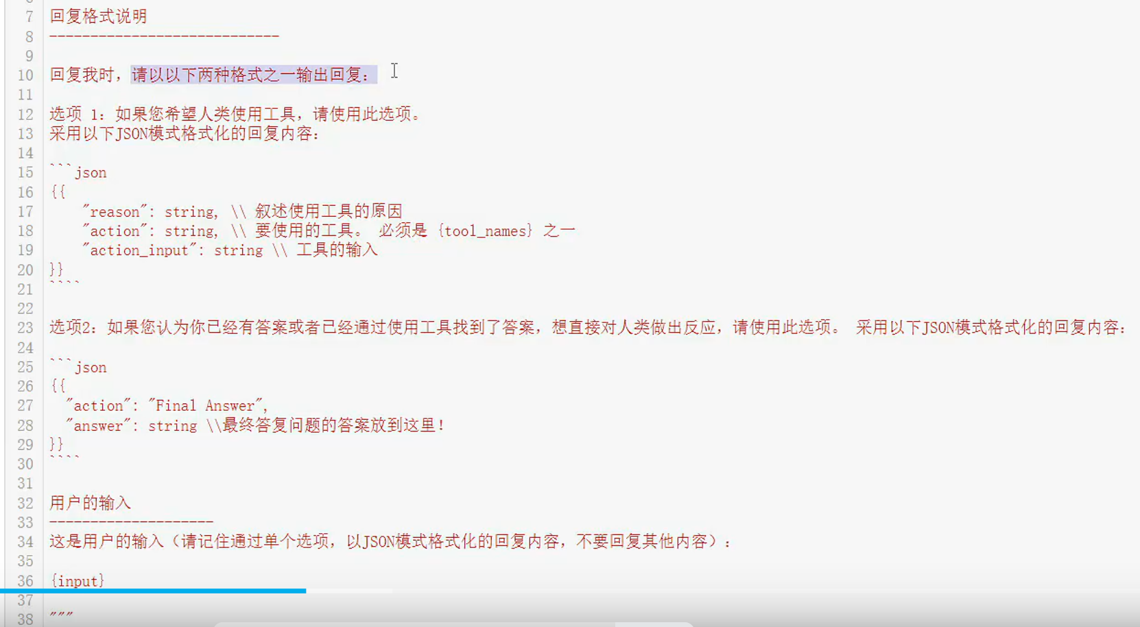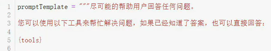 promptTemplate里有指令、tools、输出json格式的描述(两种:调action和输出Answer)、用户最新input: