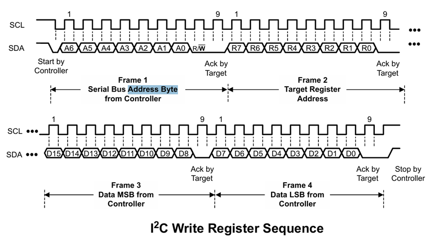 START→0x54(写)→0x1C(寄存器地址)→0x10(数据MSB)→0x1F(数据LSB)→STOP