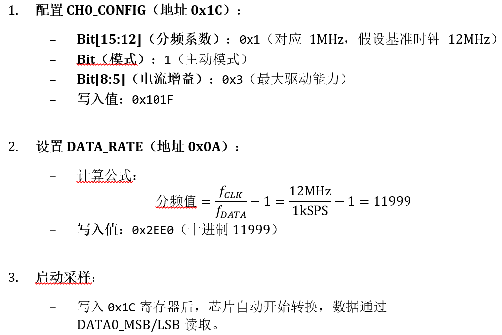 - 回读寄存器值(如CH0_CONFIG),确认与写入一致。