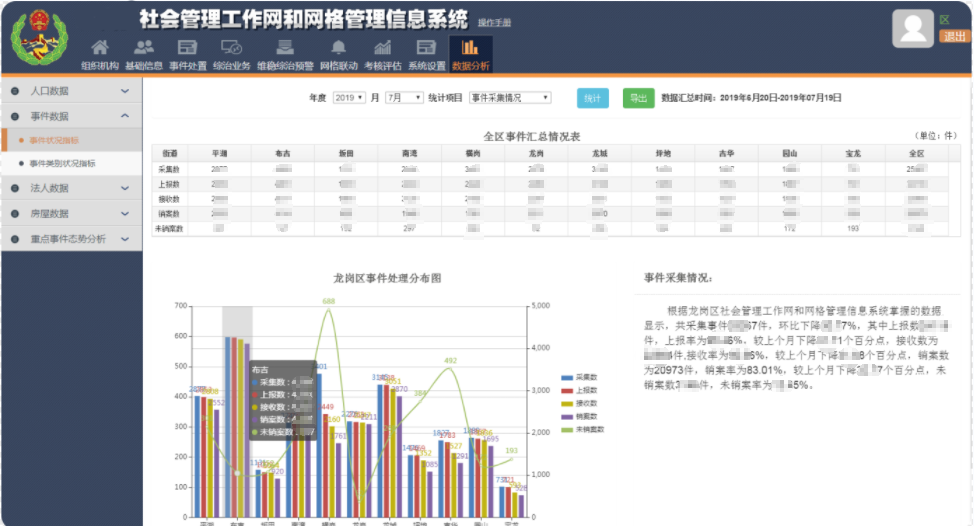 在数据获取方面,提出了人房事信息一致性获取和管理思想,创新了基于动态表单的多类型、多尺度社会治理数据一致性获取方法,采集内容自适应、成果智能关联,发明了一种实时大数据计算与存储方法,汇聚实时数据并规整。突破了网格采集实时大数据高效计算与存储关键技术,采集速度提升3倍;解决了多源异构社会治理数据即时灵活获取的难题。