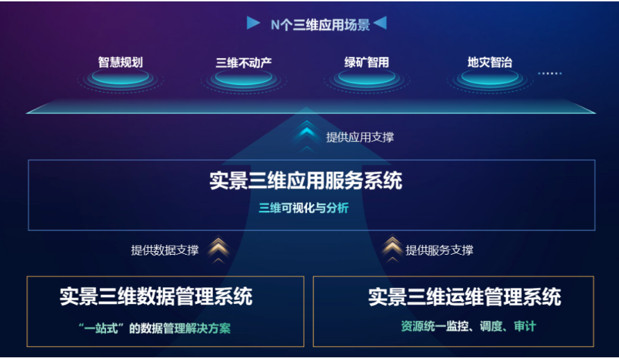 依托“一库、三系统、N应用”总体架构,实景三维平台具备三维数据快捷治理、超大三维场景高效可视化、丰富的三维专题分析三大核心能力,提供从可视浏览、物联感知、应用升级到模拟推演递进式三维场景服务,助力实景三维中国建设。