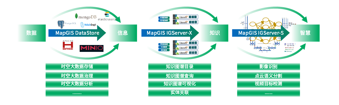 在研制MapGIS 10.6的过程中,研发团队从“DIKW模型”中吸取了大数据智能GIS新的灵感。中地数码认为以“DIKW模型”来看时空大数据,实现时空大数据的价值,仅有时空大数据还不够,还需要有相应的GIS软件工具以及相应的分析模型,并且只有这三者结合起来,才能让时空大数据产生价值。时空大数据是记录世界的原始素材,通过MapGIS DataStore分布式存储引擎进行存储;这些数据采用MapGIS IGServer-X进行数据加工处理后得到有逻辑的数据进而形成时空信息;这些信息采用MapGIS IGServer-S进行组织化系统化形成时空知识;知识经过应用之后可以得到智慧,可用于预测未来。