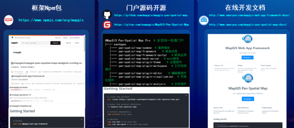 全空间一张图产品提供丰富的开发资源,相关NPM包已上架NPM官网,部分源码开放托管至Github和Gitee,也可以从smaryun云线上获取开发资源和资料,便于开发者快速搭建全空间一张图行业应用。