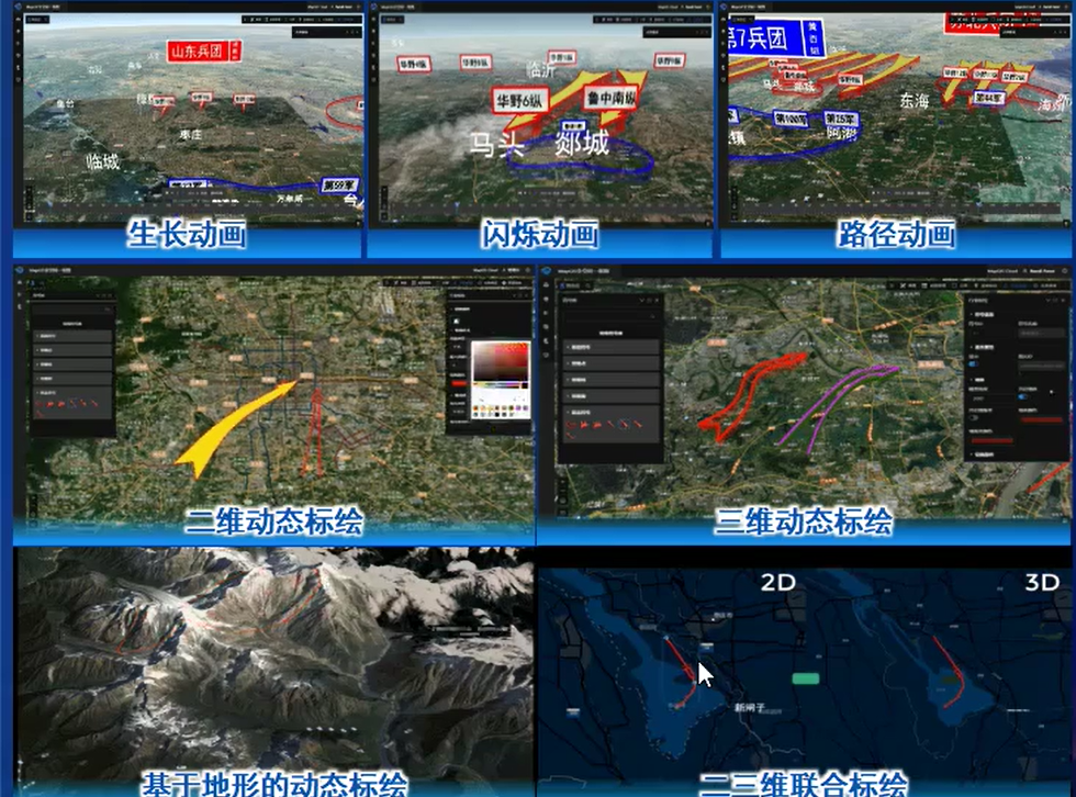 MapGIS 10.6全空间一张图产品新增了动态标绘系列组件,提供符号管理、资源加载、鼠标交互、脚本制作、态势推演、场景联动等多维度的二三维标绘资源一体化管理功能;支持二三维行业符号一体化管理,预置了常规图标、军事标绘、公安行业图标等资源,支持点、线、面、模型、标注等类型符号,并可采用SVG方式动态扩充符号资源;动态标绘支持二三维联合编辑与漫游,提供态势脚本制作和管理组件,可结合闪烁、显隐、属性、生长、比例、路径等多种态势推演动画,可按时间序列模拟态势演变过程。
