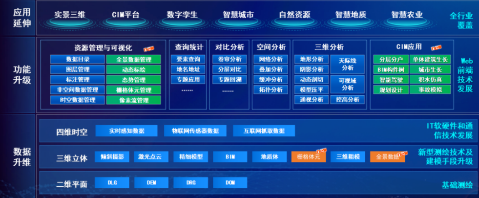随着IT软硬件、通信技术的发展,以及各种新型测绘技术和数据建模手段的加持,促使MapGIS全空间一张图产品从数据、功能、应用等方面升维,在数据方面新增接入栅格体元、网格数据、时空数据、全景数据等数据类型,实现从二维平面、到三维立体、再到四维时空的多维数据管理;在功能方面新增了多个资源管理与可视化组件,以及多个CIM应用组件,以更好地支撑全空间一张图行业应用开发;在数据和功能的支撑下,根据行业特性定制开发模板,根据行业数据特点,组合通用功能和行业特色功能,实现行业应用快速定制,将应用范围已延伸至实景三维、CIM平台、数字孪生城市 、自然资源、智慧城市、智慧农业等众多领域。