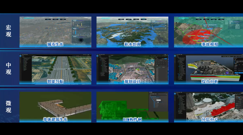 结合CIM基础平台技术导则的需要和CIM应用开发的需求,MapGS 10.6全空间一张图产品提供了城市生长、积水仿真、事故模拟、智能驾驶、单体建筑物生长等仿真模拟类组件,以及规划设计、控高分析、天际线等城市规划类组件,并结合实景三维、BIM标准,实体关联等技术,研发了分层分户、BIM构件树等组件,实现从宏观、中观、微观等CIM全场景覆盖。