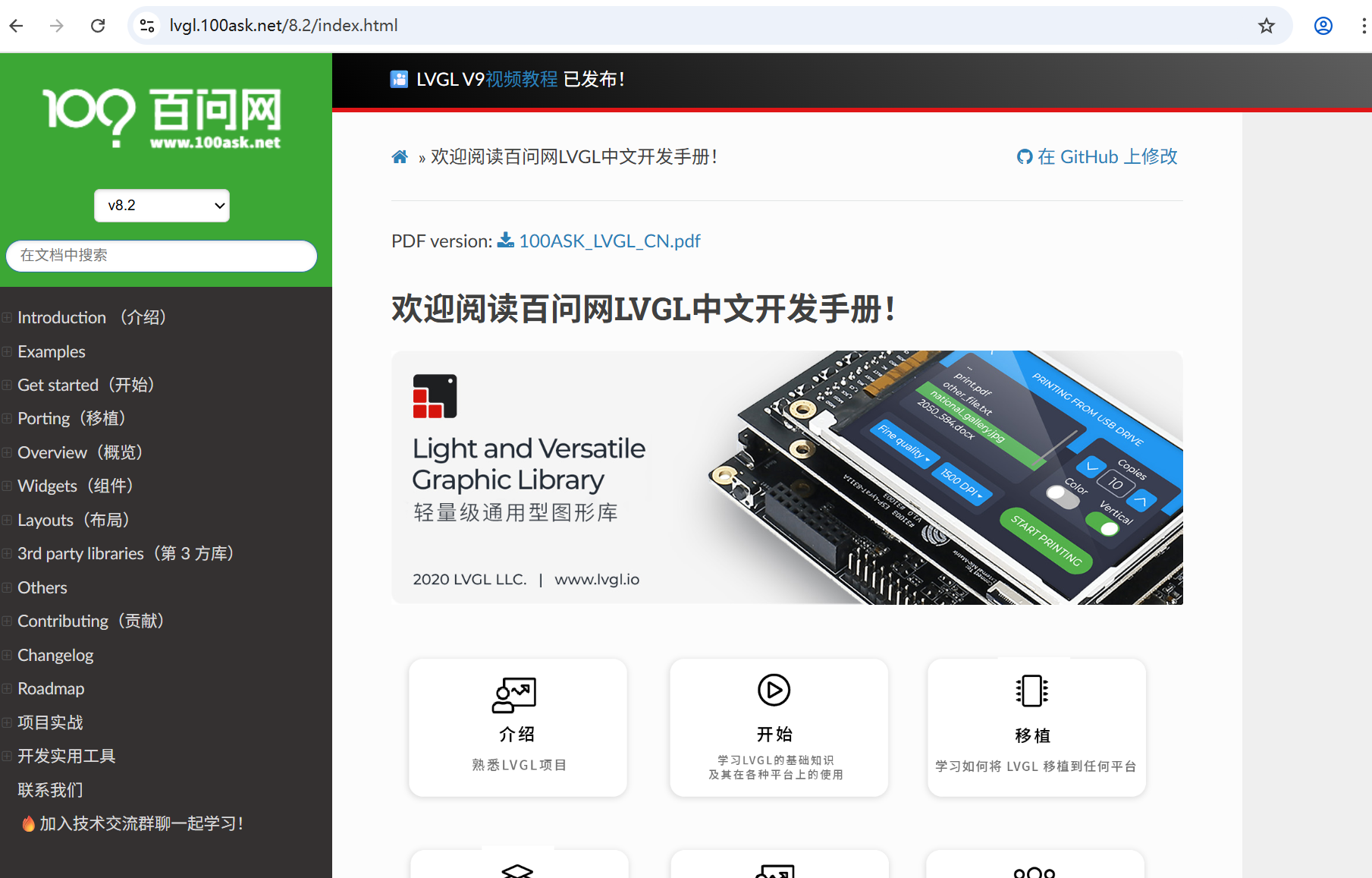 http://lvgl.100ask.net/8.2/index.html (相关开发文档界面)