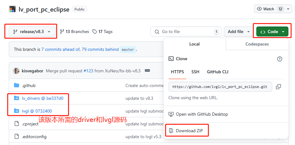 注意是下载三个压缩包文件分别为 release/v8.3下下载压缩包;点击进入上图框中的driver里面下载压缩包文件; 点击进入上图框中的lvgl里面下载压缩包文件;