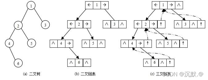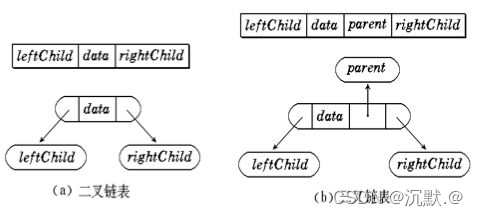 链表中每个结点由三个域组成,数据域和左右指针域,左右指针分别用来给出该结点左孩子和右孩子所