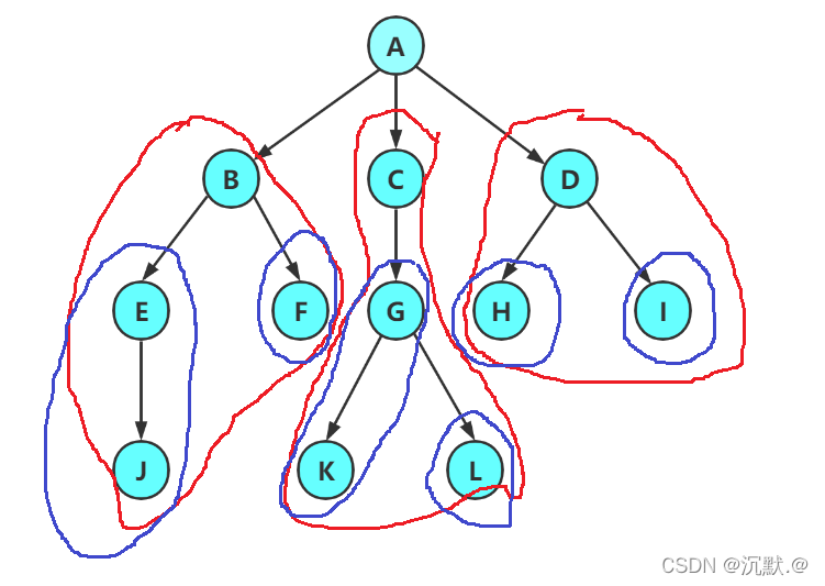那么,再接着,又可以继续像上面一样,把B,C,D的子结点再看成一棵独立的树(如图中蓝色的笔画圈出)