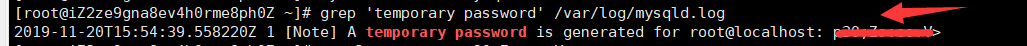 执行grep 'temporary password' /var/log/mysqld.log(箭头所在的地方是初始化后的密码)