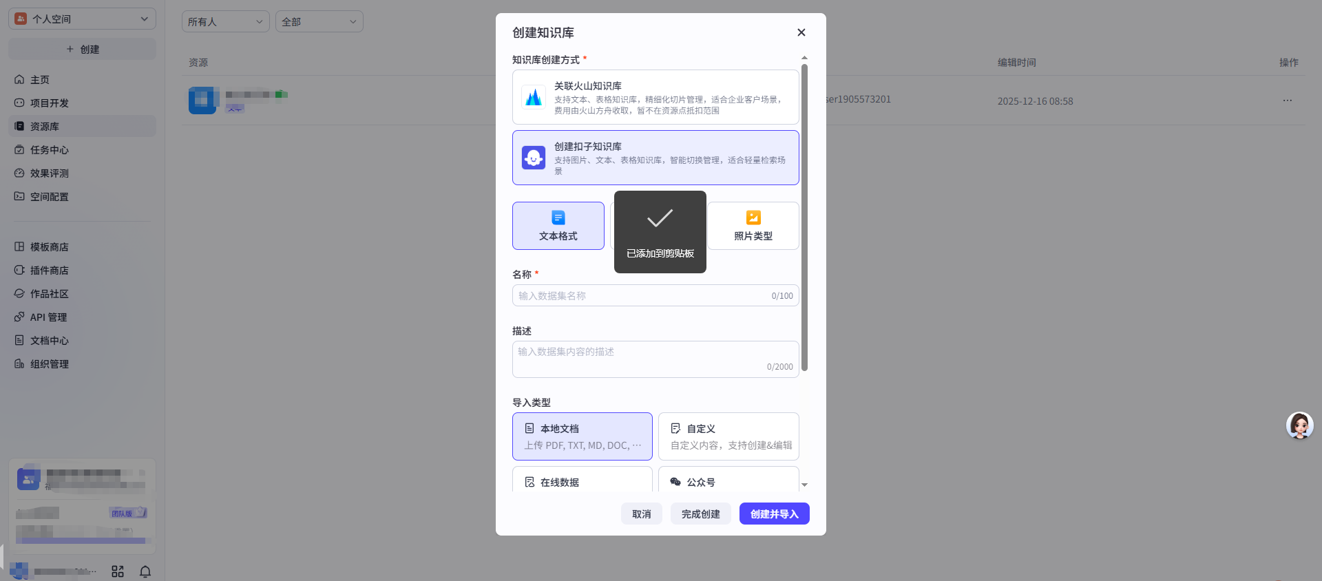 4.创建知识库(支持丰富的导入途径,涵盖了本地文档、网络数据源、Notion和飞书等多种选择)