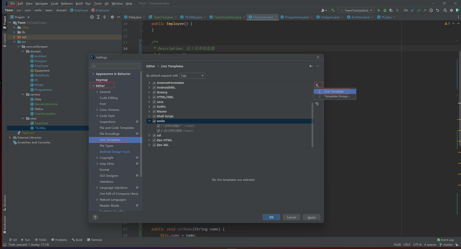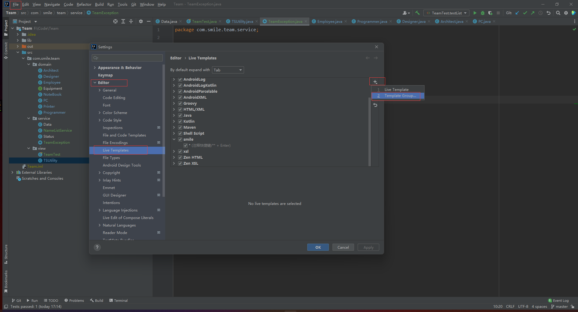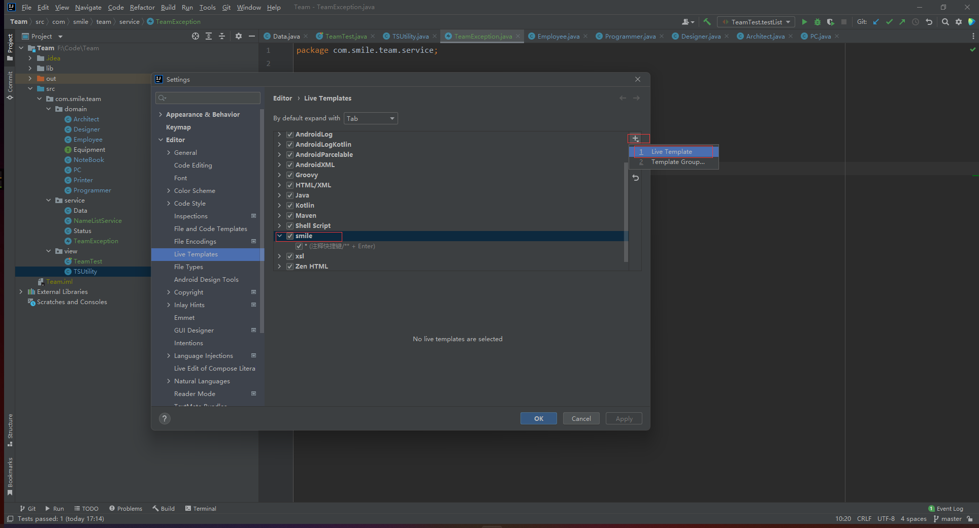 点击左上角file-sttings-Editor-Live Templates-smile-"+"-Live Template