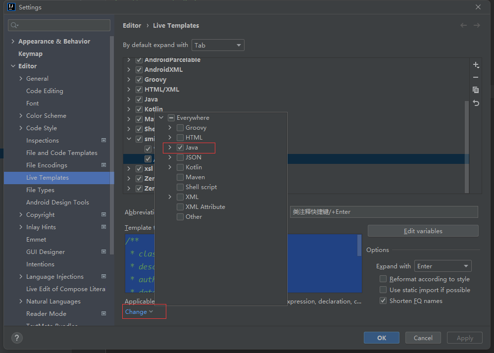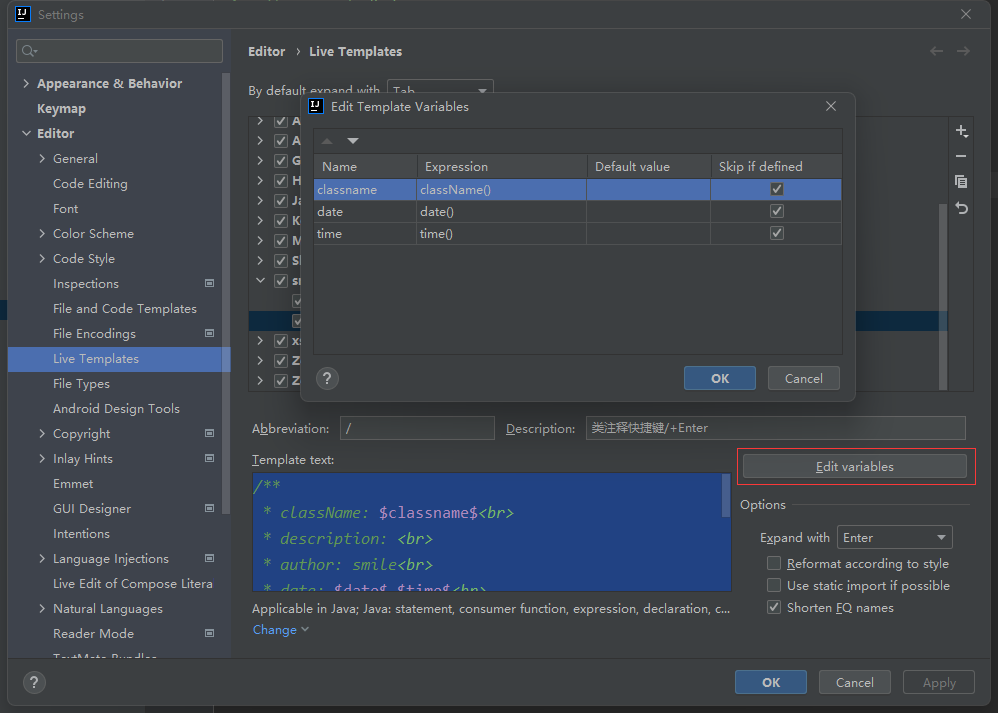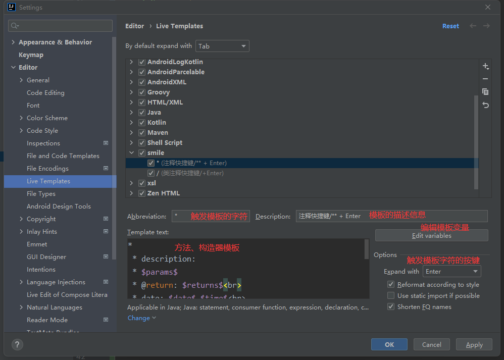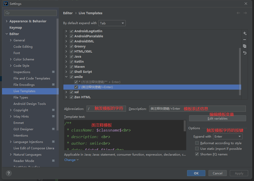 点击左上角file-sttings-Editor-Live Templates-smile-"+"-Live Template