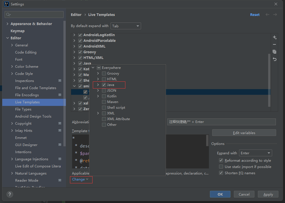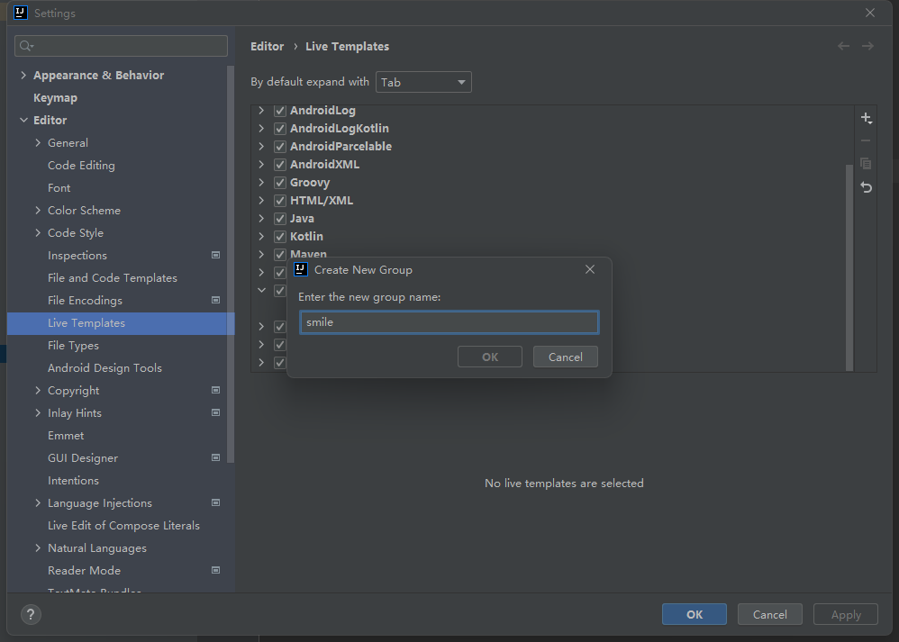 选择刚刚创建的Group后点击+再点击Live Template创建实时模板