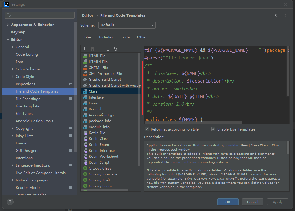 点击左上角file-sttings-Editor-File and Code Templates-files-Class