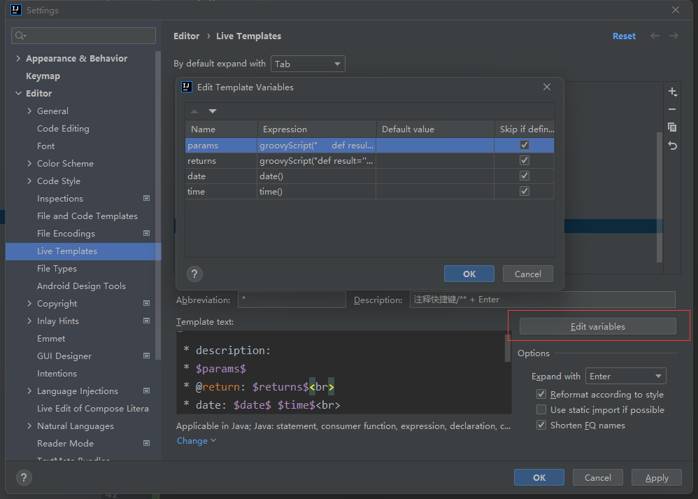 Skip if defined:跳出编辑模式(勾选后当模板在代码里生成时光标不会自动跳到改变量上)