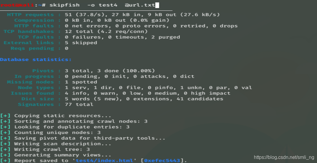 skipfish是基于C语言编写的一款web安全评估工具,其特点速度快,递归爬网,误报低。