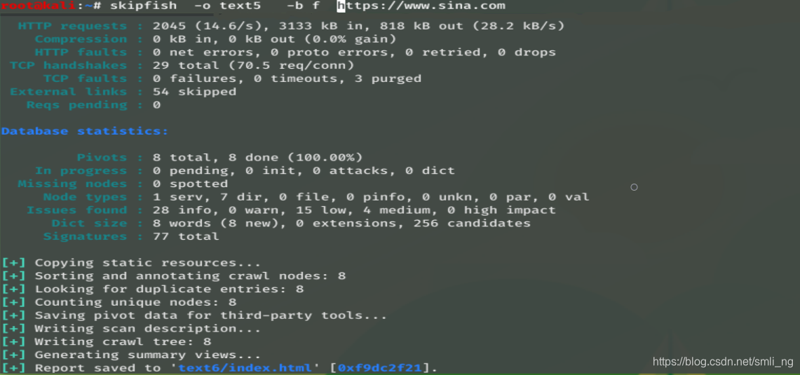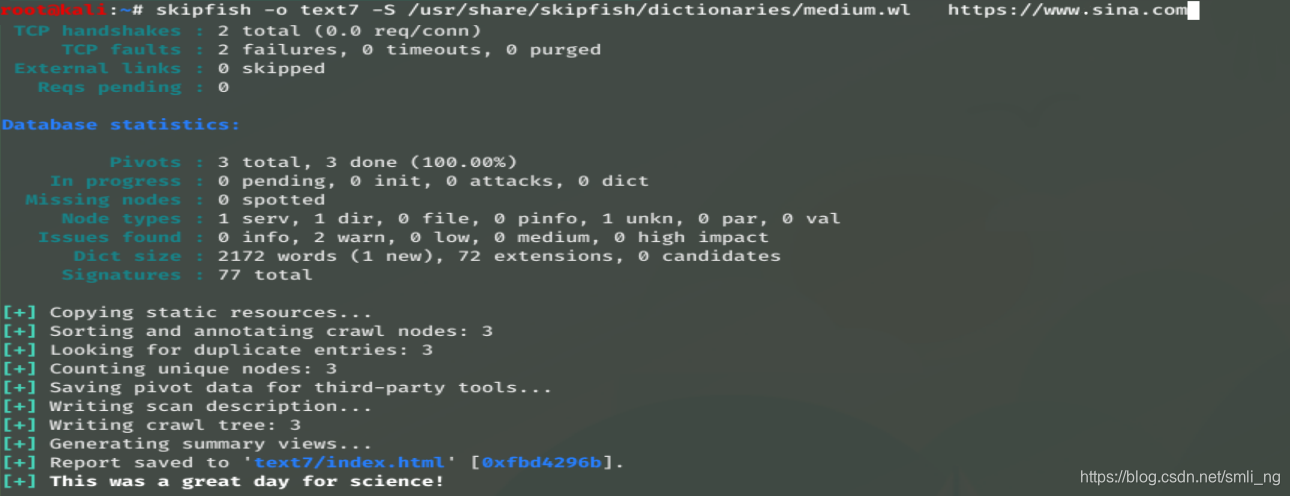 skipfish -o text7 -S /usr/share/skipfish/dictionaries/medium.wl https://www.sina.com