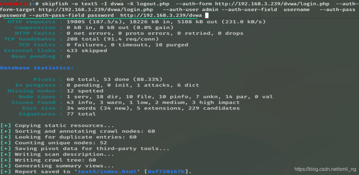 skipfish -o text5 -I dvwa -X logout.php --auth-form http://192.168.3.239/dvwa/login.php --auth-form-target http://192.168.3.239/dvwa/login.php --auth-user-field username --auth -user admin --auth-pass-field password --auth-pass password http://192.168.3.239/dvwa